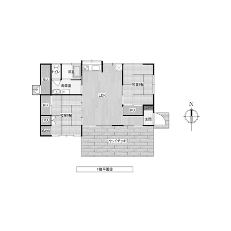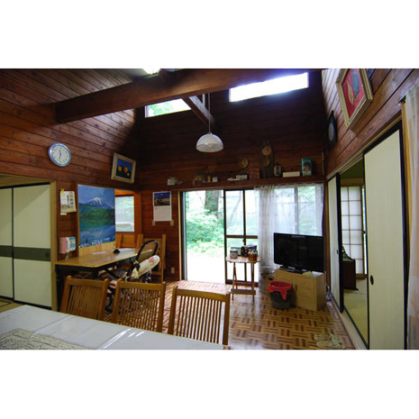 平屋なのに、リビングはなんと吹き抜けだ。天窓からはさんさんと日射しが差し込み、とても明るく開放感溢れるスペースになっている。庭先のウッドデッキは、リビングにそのまま繋がっているので、天気の良い日は部屋の延長として使うことができる。キッチンで食材の下ごしらえをしたら、リビングを抜けてウッドデッキへ直通。鳥のさえずりを聞きながらバーベキューを楽しみ、ウッドデッキをステージ代わりに、みんなで楽器を持ち寄って演奏する、なんていうのはどうだろうか。富士山の大自然が観客だ。いつもよりずっとのびのびと、気兼ねなく演奏を楽しめるのではないだろうか。