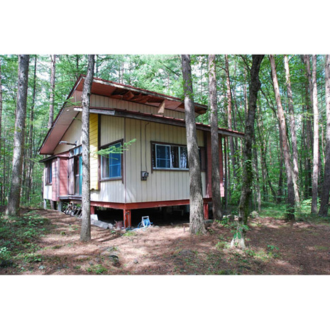 今回の物件は、木立の中に仲良く並ぶ、互い違いの屋根の2棟だ。2つあわせて1セットとなっている。仲の良い双子のイエを、どうしたって引き裂くわけにはいかないから。