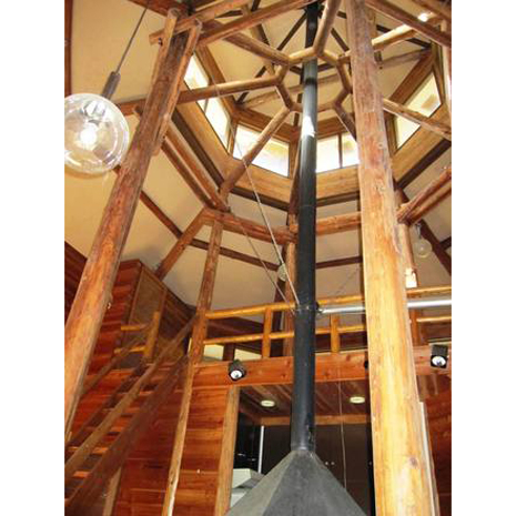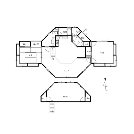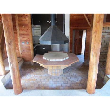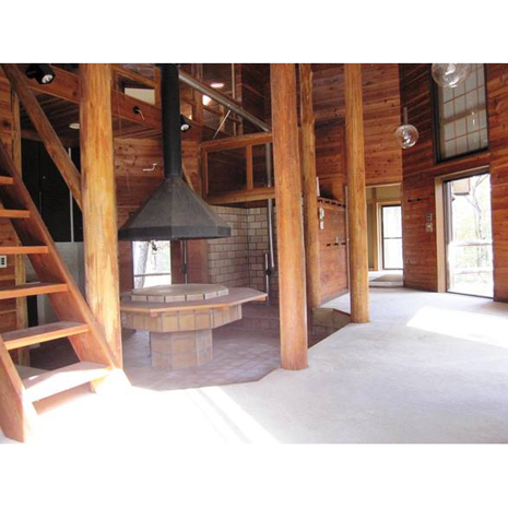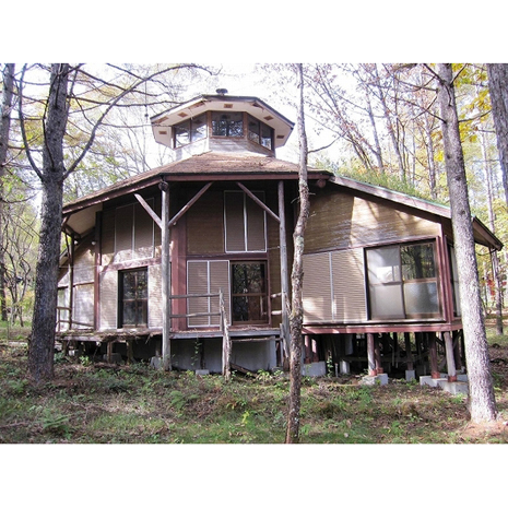 そんな野辺山に、意匠を凝らしたログハウスが建っている。その悠々たる左右対称のフォルムは、人工衛星を連想させる。八角形の本体部分に、両翼のように8畳と6畳の和室が張り出している。吹き抜けのLDKの真ん中には、かつて暖炉として使われていたのであろう、これまた八角形の造り付けのテーブルがある。