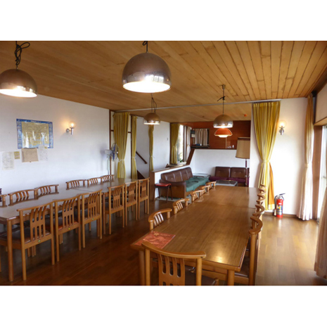 1階のリビングダイニングは、33帖という圧倒的な広さを持つ。ときには区切って使えるように、カーテンレールが設置されている。寮のような食卓となっているが、工夫次第で広々としたダイニングに作り変えることもできそうだ。