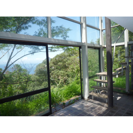 伊豆半島の先のあたり。山にありながらも、見える景色は一面緑と海と空という、格別なロケーションを備えた家を発見した。