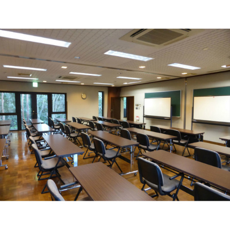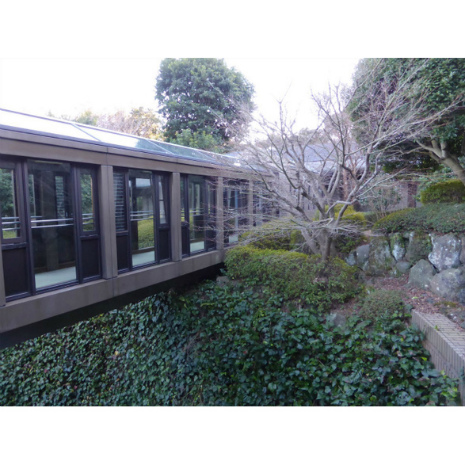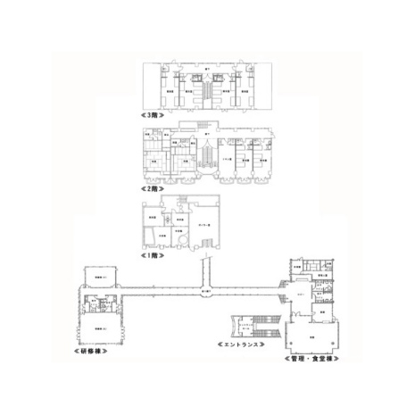 建物自体の造りも非常に興味深い。攻めてる。いや、浮いている。建物自体は三階建てで、周囲の緑に調和した御用邸風の雅な雰囲気だ。では何がそんなに攻めているのか?その答えは研修棟と食堂、客室の3つのコアを結ぶ長い渡り廊下にある。間取り図を見るとわかるように、研修棟と食堂は客室のある建物からは離れた所にある。左右に大きく分かれた二つの建物は長い廊下でつながり、その真ん中で客室のある棟へと通じている。この逆Tの字みたいな渡り廊下が宙に浮いているのである。
