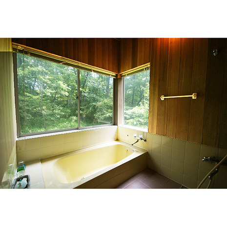 遊び過ぎて遅く起きた朝は、ゲストにゆっくりと朝風呂を楽しんでもらおう。基礎高を活かしてプライベート性を高めた浴室は、屋外ではないものの露天風呂気分を味わうにはぴったりだ。ただし、窓から見える那須の森に目を奪われ、うっかりのぼせてしまわないよう、ひとこと言い添えるのをお忘れなく。