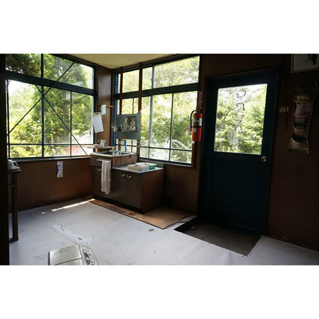 作業場の西側にはガラス戸で仕切られた昔の職員室みたいな事務所スペースがあり、何かと汚れがちな工場にはマストの水回りもついている。事務所内は三面を窓で囲まれ十分にに明るいのだが、既存の植栽でうまい具合に外からの視線もカットされている。お好みでバッサリと枝払いをしてさらに明るくすることもできるし、新たに好みの植栽に植え替えてガーデニングを楽しむのもいいだろう。