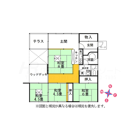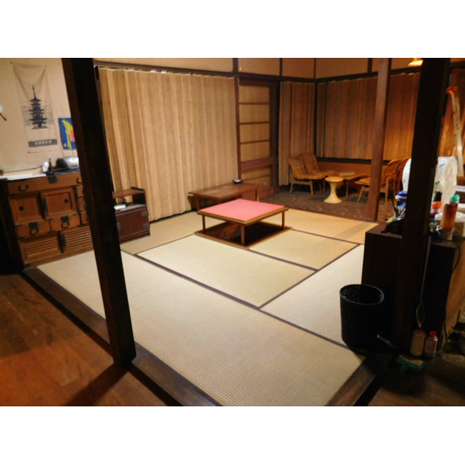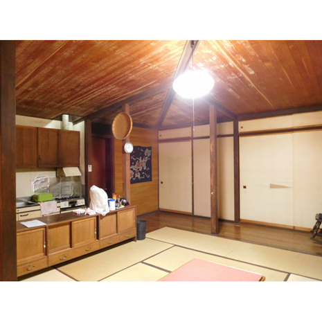 こちらの別荘、間取り図を見て頂くとよくわかるのだが、中心になる8畳の和室を各個室がぐるりと囲むように配置されている。8畳の和室の北側は土間になっており、低めの応接セットやダイニングテーブルを置いてもまだ空間に余裕があるほどだ。土間と和室で1つの空間として考えると広く感じられるだろう。