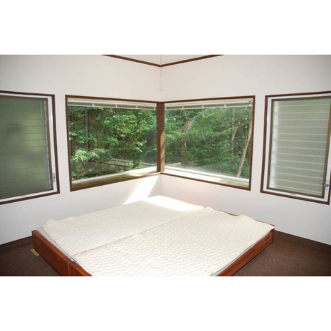 裏庭方向に突き出した格好の2階洋室は1階同様2面が窓になっており、自然の緑が目に優しい。3階は屋根裏的な造りで、造り付けのベッドやロフトが隠れ家のようだ。大勢で寝泊まりする際や、子ども達の秘密基地的な遊び場として重宝するだろう。