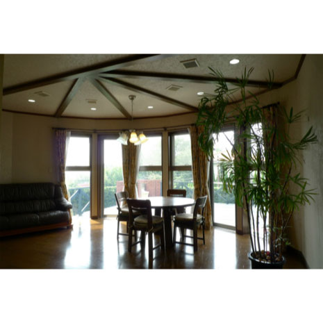 ラウンド型の食堂はダンスホールのようにも見える。写真のようにダイニングテーブルを置いてもいいが、ピアノやギター、ドラムなどの楽器を置いて、趣味の間にしてしまうのも良さそうだ。