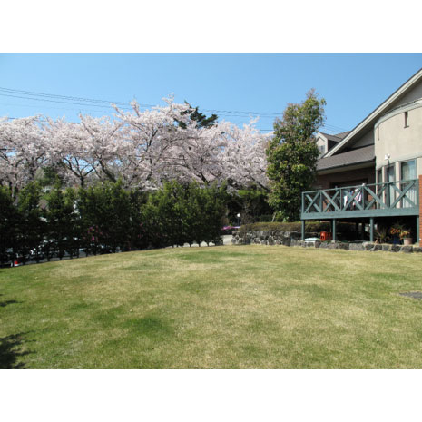 春は玄関先の桜並木が綺麗な花を咲かせるので、庭の芝生で花見を楽しめる。バーベキューコーナーを使って料理をつくり、ギターを弾いて、持ち寄ったお酒を飲み交わす。ここではそんな生活が楽しめる。