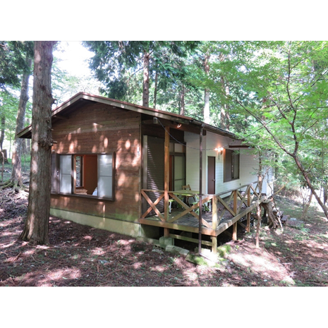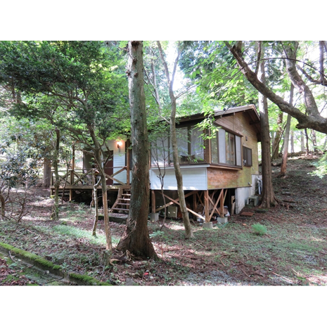 伊豆山奥。ひっそりほっこり山荘風のミニマルな建物は、立派な木に囲まれて次なる遊び相手を待っている。