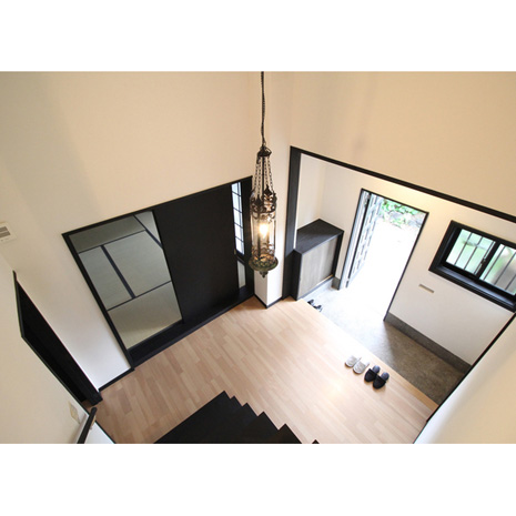 室内はギャラリーのような余白を楽しむシンプルな空間だ。白鷺のように真っ白な吹き抜けの玄関ホールの壁。書、現代アート、少数民族の仮面など、美しき物たちがよく映えることだろう。