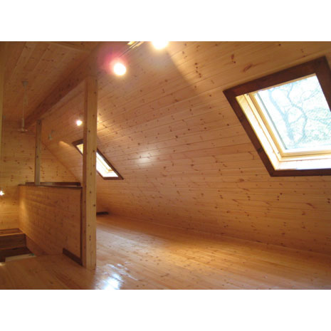 森の中にちょこんと建つログハウス。二階部分は屋根のラインに沿って、天井が斜めになっている。