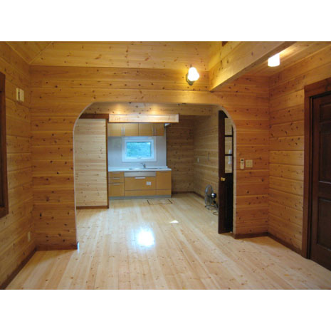 伊豆高原の桜並木からも近い場所ながら自然がふんだんにあり、窓からは見渡す限りの木々。ログハウスにはお約束のポーチもあり、まるでアメリカの片田舎に迷い込んだような独特の風情がある。表に蒔が積んであったら、なんとも絵になりそうだ(残念ながら風呂は薪で焚くタイプではない)。