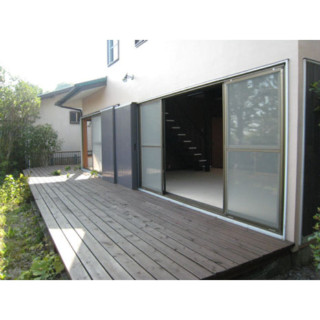 テラス部分は、ちょっとしたアウトドアスペースとして考えてもたいへん楽しめると思います。テントを立ててみたり、キャンプグッズを置いて夜はここで食事をとっても。スタンドタイプのハンモックは、雨のときには屋内に仕舞うこともできて非常に便利です。