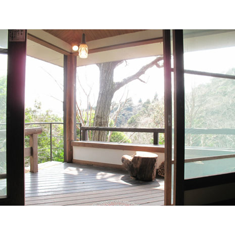 2階は和室で、障子を開けると吹き抜け部分に繋がっている。押し入れもおよそ2間分ほどあり、収納に不自由ない。さらに浴室は石造りの落ち着いた造り。窓の外の木々を楽しみながら温泉に入りたい。