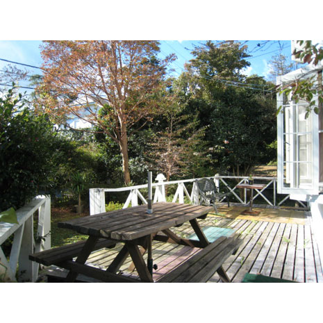テラスからの眺めが心地よい、伊豆高原の飲食可物件。住居スペースもしっかり確保されており、暮らしながら商売を行うことができる。導入コストも含め、これまで店を開きたいと思っていた人に是非おすすめしたい物件だ。