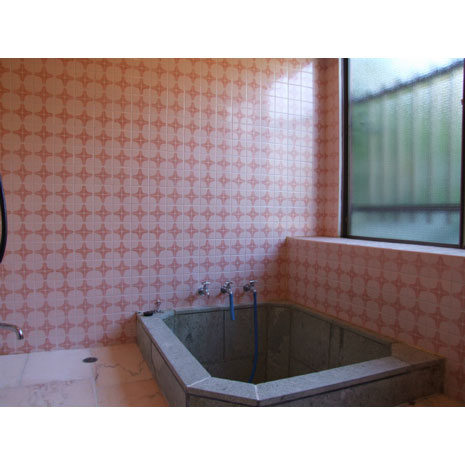 味のあるピンク色のバスルームはこのまま残しても良いかもしれないが、テイストを変えたければ自分たちでタイルを貼えてみても。海外製のタイルが手に入ったらぜひ使いたい。浴室がグレーの石なので、どんな色でもしっくり来そうだ。手製のタイルを眺めながら、のんびりと温泉でくつろぎたい。