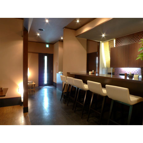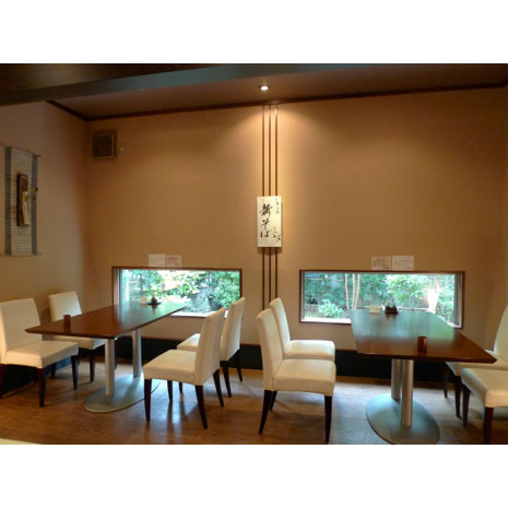 玄関横の丸い窓からは蕎麦打ちの様子を覗くことができ、待つ人々の目を楽しませてくれる。店内の内装も洗練されており、新しい感覚の店舗という印象を受ける。客席横の窓は低めに設置されていて、通行者の目を気にすることなく食事を楽しむことができるし、カウンター裏の厨房が見えないよう設計されている。
