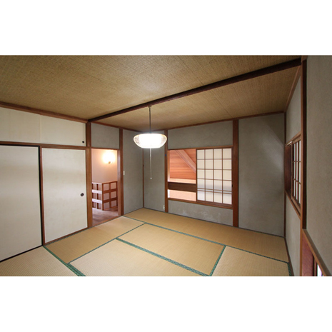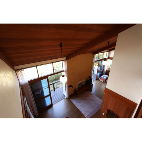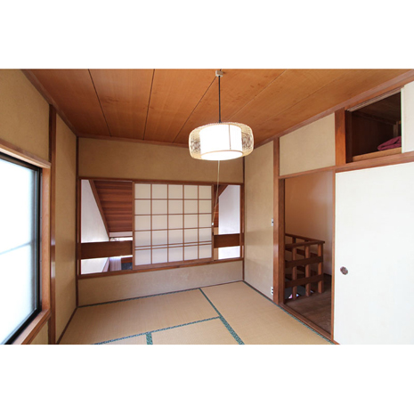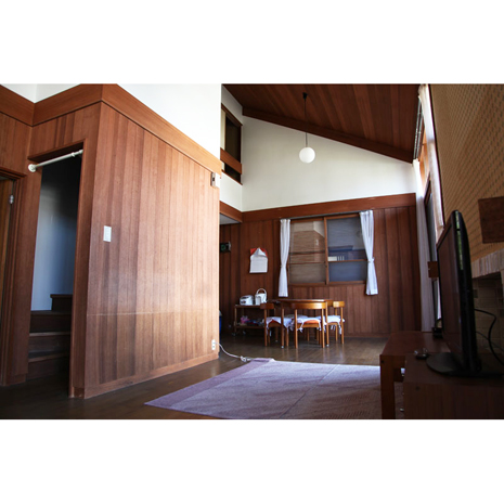 築は古いが、定期的に利用されているためか、古さが醸し出す雰囲気が妙に心地よく落ち着く。リビング・ダイニングの全面はすべて吹き抜けのため、天井が高く板張りの仕様。吹き抜けを通じて全ての居室はつながっている一体感のある家。だから、音楽を流せば、家中で音楽を共有でき、料理をすればいい匂いも共有できる、楽しそうな雰囲気も、ゆったりとした時間も、集ったメンバーみんなで共有する、そんな時間を過ごしてほしい。